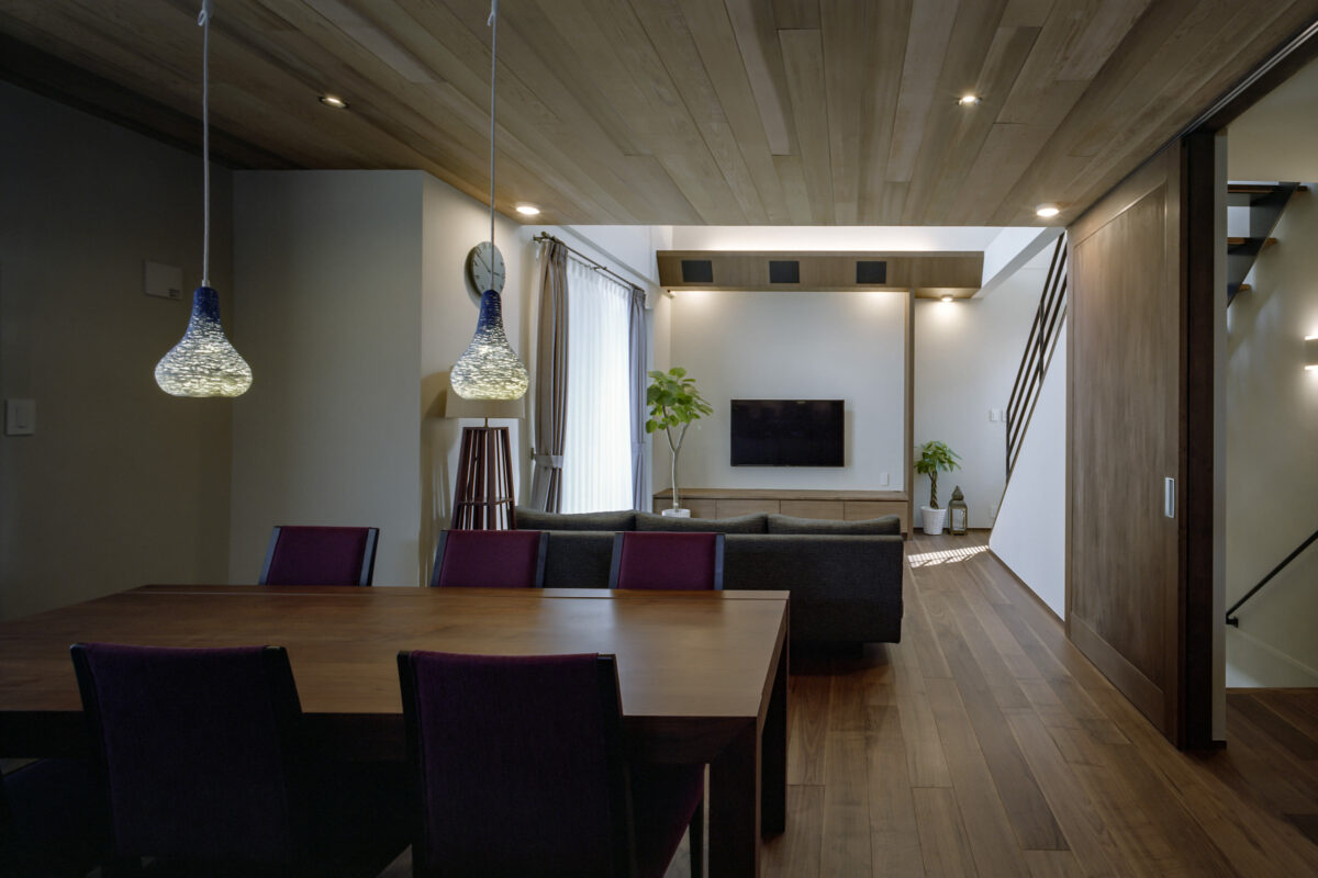 2階のLDKと3階の寝室、子供室とはリビングの吹き抜け内の階段を通って行き来することで家族のコミュニケーションが取りやすい動線計画としている。