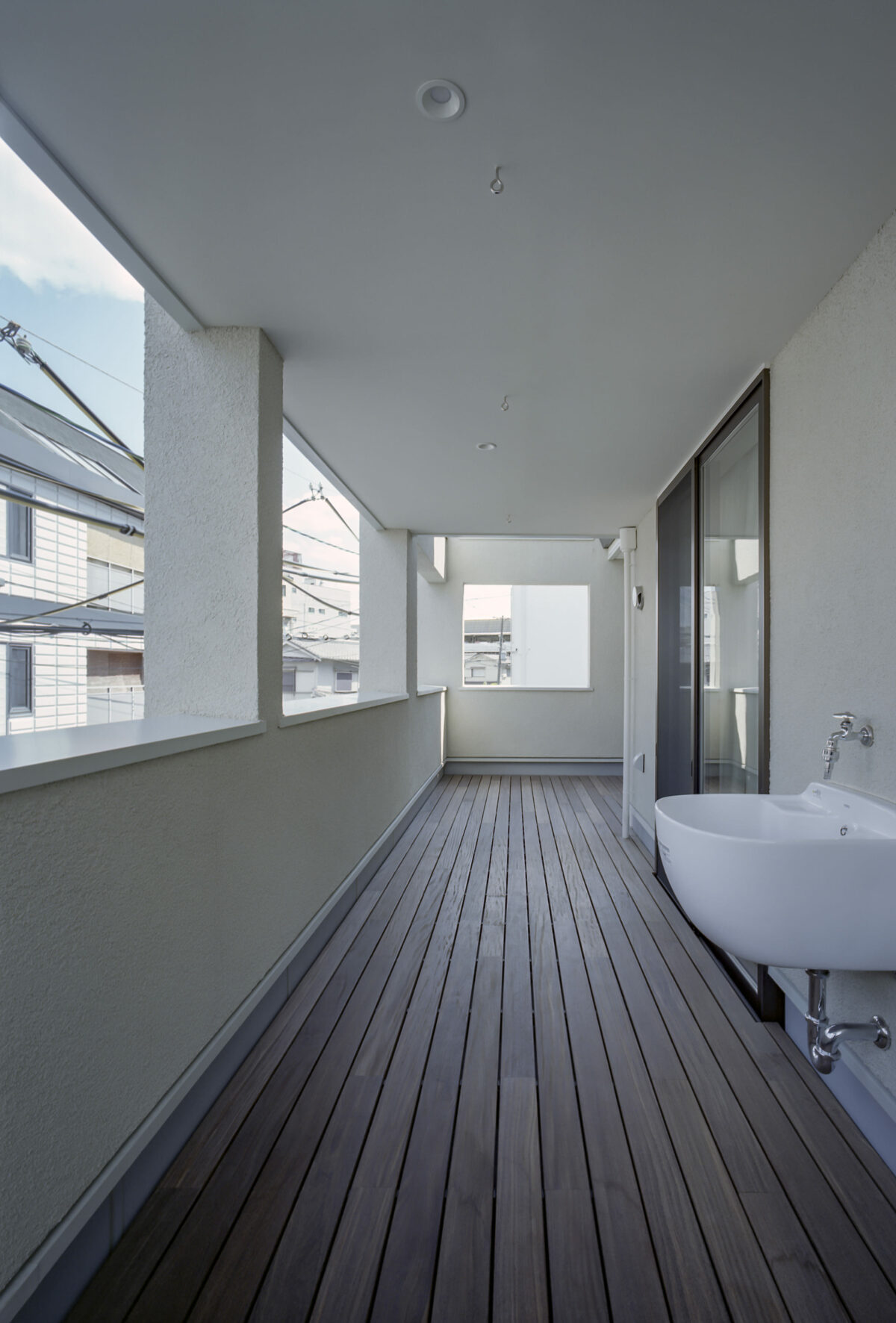 採光を取るための東面の大きな開口部は道路に接しているため、外からの視線をコントロールする緩衝スペースでかつ庭に替わる外部スペースとなるよう2、3階には奥行の深いバルコニーを設けた。